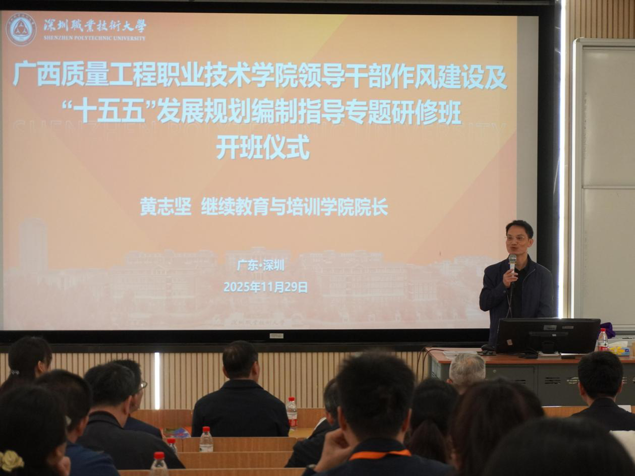 2025年11月29日上午,广西质量工程职业技术学院领导干部作风建设及“十五五”发展规划编制指导专题研修班在我校留仙洞园区德业楼107室正式开班。广西市场监管局二级巡视员、学院党委书记凌紫毅带队,党委副书记、纪委书记曾常,副校长刘婷及学院中层管理骨干等参加培训。我校继续教育与培训学院院长黄志坚出席并致辞,开班仪式由继培学院项目主管邢志国主持。