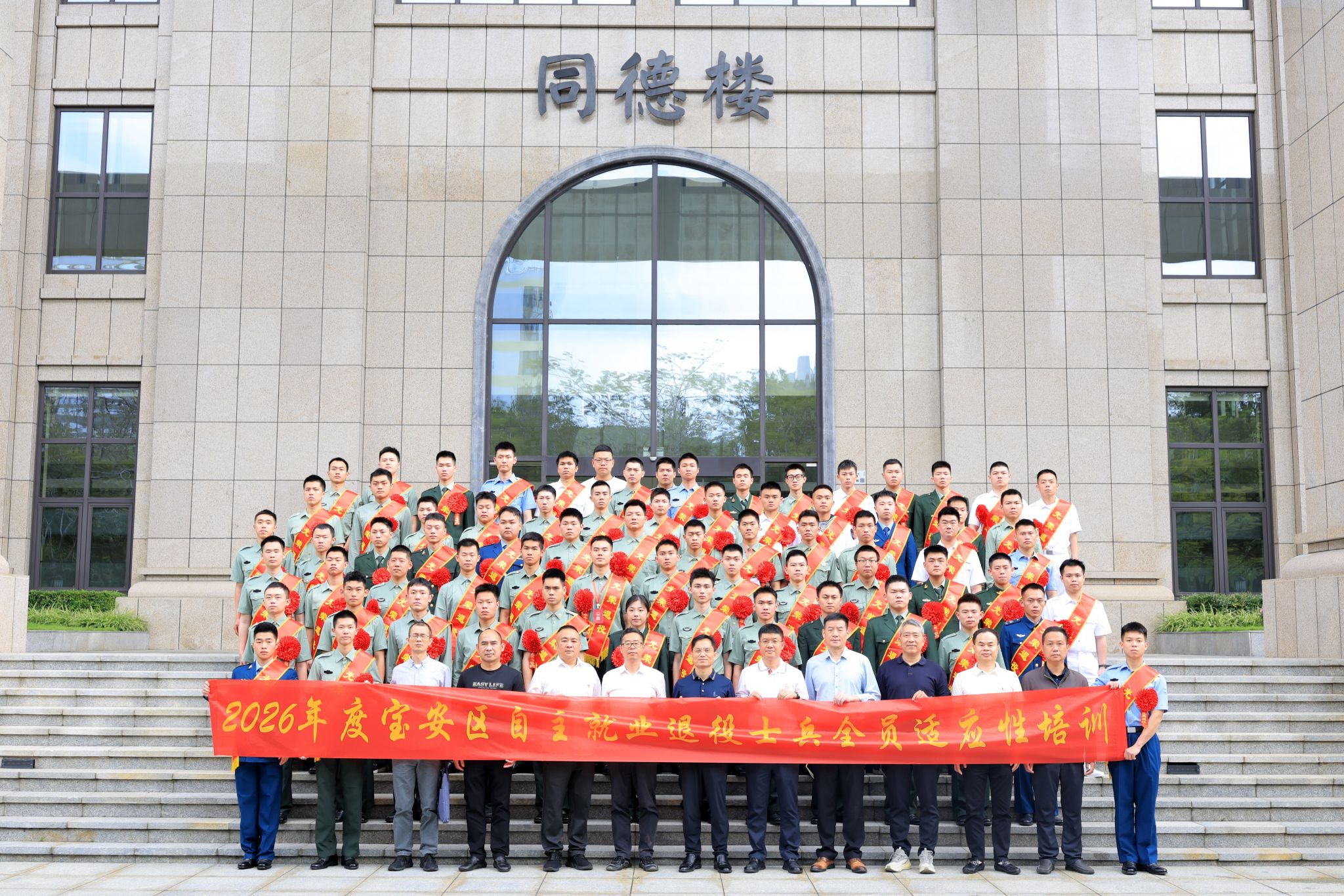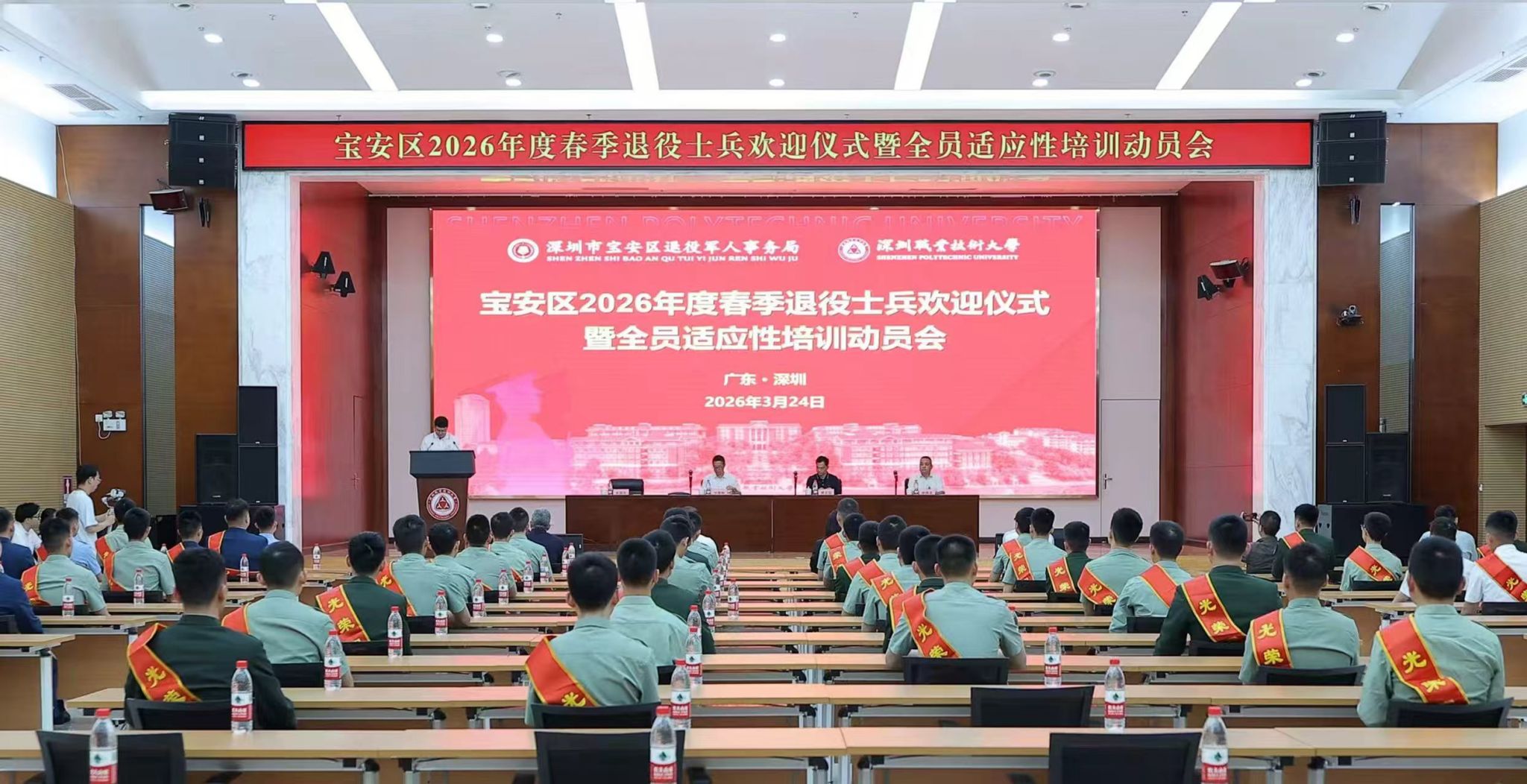 3月24日上午,宝安区2026年度春季退役士兵欢迎仪式暨全员适应性培训动员会在我校留仙洞园区同德楼一号会议厅举行。宝安区退役军人事务局党组书记、局长沈建刚,第十二届全国人大代表、老山前线一等功臣谢晓波大校,继培学院党总支书记、院长黄志坚、副院长吴国庆等出席仪式。来自宝安区各街道的74名春季自主就业退役士兵参加活动。