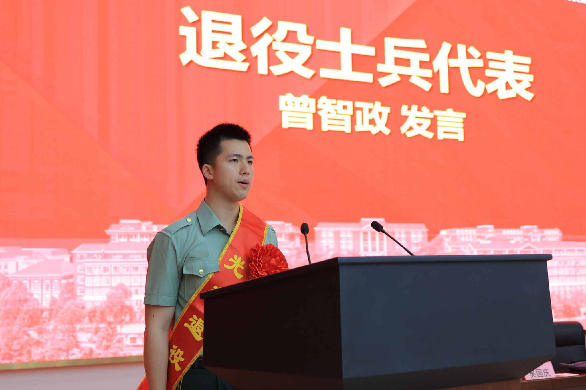退役士兵代表曾智政上台发言并带领全体退役士兵重温退役誓词。“若有战,召必回”的铮铮誓言响彻会场,展现了退役军人永葆本色、矢志报国的坚定信念。